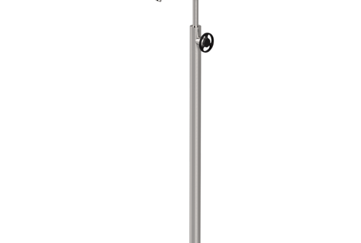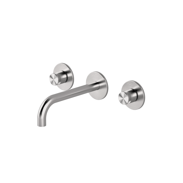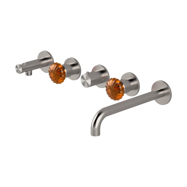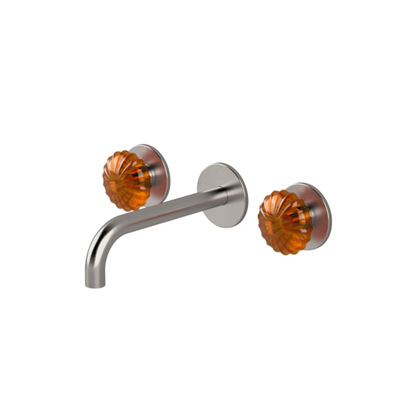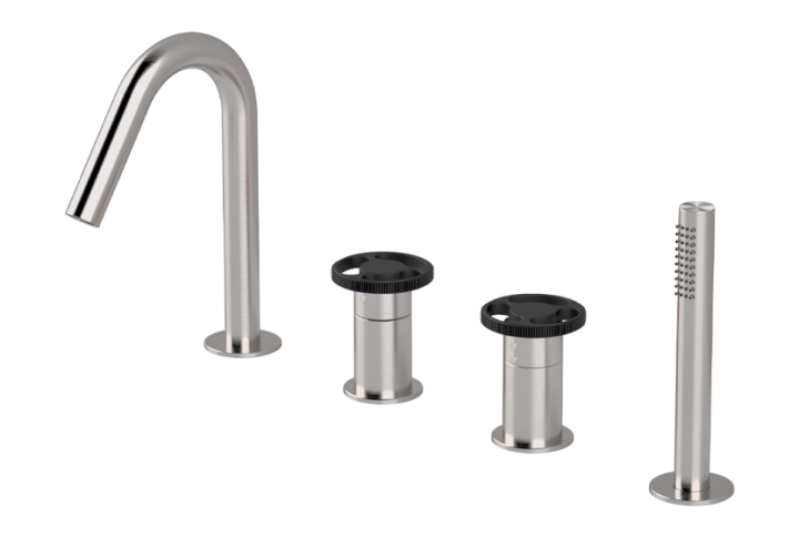 2-hole sink mixer with swivel bridge-shaped spout and remote control on deck